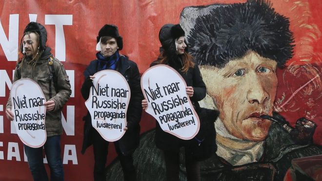 | Ukrainians in Kiev urged the Dutch not to listen to "Russian propaganda" - using the famous image of Van Gogh with bandaged ear |
