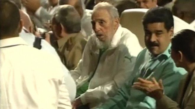 | Fidel Castro was seen alongside his brother Raul and Venezuelan President Nicolas Maduro |